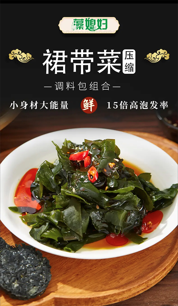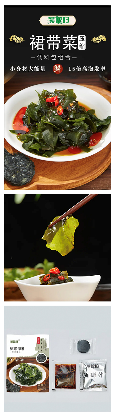 2.压缩烘干裙带菜,免洗无沙,不仅可以凉拌烫火锅还可以煮粥煮面煮汤, 产品清爽美味、脆滑可口。